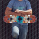 Psychedelisches Rot-Blau-Kaleidoskop-Muster mit Schädeln