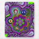 Ein mousepad mit einem bunten psychedelischen Entwurf mit abstrakten Blumen, einem Herzen und einem Friedenszeichen. Er wird ganz durch lila Paisley umgeben.