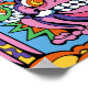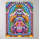 Diese hochgradig komplexe und lebendige Abbildung zeigt eine fantastische, gestapelte totem-ähnliche Kreatur oder Sein, reich an psychedelischen Einflüssen. An der Basis befindet sich eine große, grinsende, frogartige Einheit in Rosa- und lila-Tönen, mit mehreren Augen und einem breiten, zahnbehafteten Lächeln. Darüber befindet sich ein weiteres mit Augen, abstraktes Gesicht mit einem prominenten dritten Auge, das mit gelben und rosa gewölbten Elementen geschmückt ist, die Federn oder Flammen ähneln. Die Krönung des Stacks ist ein stilisierter weißer Schädel, gerahmt durch zackige, farbenfrohe Strahlen und wirbelnde Wolken. Die gesamte Komposition besteht aus Set in einem gewölbten Zierrahmen mit fett-farbigen Mustern und einem hellblauen Hintergrund. Der Kunststil erinnert an konterkulturelle Plakate und Volkskunst der 60er Jahre.