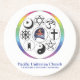 Der runde Untersetzer mit pazifischem Logo der unitarischen Kirche umgeben durch 8 der Welten major Religionen.