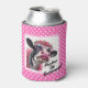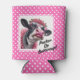 Ein skurriler und lustiger Dose/Flasche/Seltzer cooler gemütlich mit einem pinkfarbenen und weißen Polka gepunkteten Hintergrund, einer schwarz-weißen Kuh mit rosa Brillen, rosa Kleid und Perlen. Spitzen-Rahmen um die Kuh und das Sprichwort, Pucker Up Buttercup! in der Ecke.