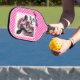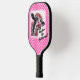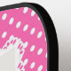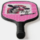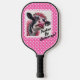 Ein skurriles und lustiges Pickleball-Paddel mit pinkfarbenem und weißem Polka gepunktetem Hintergrund, eine schwarz-weiße Kuh mit rosa Brille, rosa Kleid und Perlen. Spitzen-Rahmen um die Kuh und das Sprichwort, Pucker Up Buttercup! in der Ecke.