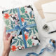 Farbenfrohe und lustige Puffin-Muster mit viel üppigem, grünem Laub auf warmen beigen Hintergrund. Lebhafte grüne und orangefarbene Farben.