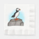 Geburtstag, Babydusche oder Jubiläumsnapkins. Digitale Kunsthandgezeichnete Puffin stehend auf einem Felsen mit blauem Hintergrund.