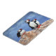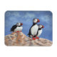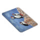 Eine gouache Illustration von drei Püffeln auf einer felsigen Klippe, Set gegen einen pulsierenden blauen Himmel.