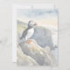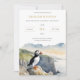 This invitation features an original digital watercolor illustration of a cute puffin on the cliffs.