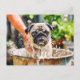 pug being bathed in a bucket, covered in soap bubbles, enjoying a playful bath time