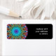 Farbenvolles Kaleidoskop mit einer aquamarinen, hellen Farbe in der Mitte. Gelbe Wellen, die über Orange- und Aquarelle fließen, landen in Rot und lila. Während ein Kaleidoskop ein sich ständig veränderndes Muster von Formen und Farben ist, ist dies eine digitale Stillversion davon. Komplexe Muster, die in einem runden Rahmen wiederholt werden.