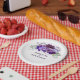 Teller aus Blumenpapier mit Pflaumen und lila Blumen