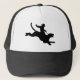 Eine schwarze Silhouette eines Cowboys, der einen sträubenden Cougar reitet.