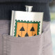 Niedliche Jack-O-Lantern Kürbis mit Briefmarke Halloween Dekor. Kürbisgesicht ist orange mit grünem Schnitt. Design erstellt von Black Brook Fotografie mit Grafik von Pixabay September 2014.