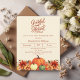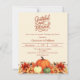 Ein zarter, beige Hintergrund. Die Einrichtung ist mit Kürbissen und orangen und gelben Blumen geschmückt. Personalisieren Sie die Party-Details und fügen Sie sie hinzu. Text-Skript: Dankbar und gesegnet. 1 Blatt = 1 Einladung mit Druckkante bis Kante.