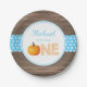 Pumpkin Fall erste Geburtstagsparty Papier Teller. Rustikaler Holzkalkstein Hintergrund.