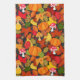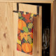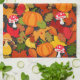 Stilvolles Kürbis gemustertes Küchenhandtuch. Farbenfrohe Herbstblätter, Eichen, Kürbis, Beeren und Toaststühle sind auf tiefgrauem Hintergrund gemustert. Moderne Herbst Ernte Küchentücher. Sie können die Hintergrundfarbe nach Ihrem Geschmack anpassen und ändern.
