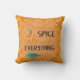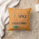Orangefarbenes Herbstkissen mit einem orangefarbenen Kürbis und aquamarinem Blatt und Text, der sagt: "Kürbisgewürz und alles Gute."