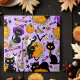 Niedliche, schwarze Katzen unter Kürbis, halloween Süßigkeiten, Fledermäuse, Besen, Sterne, Süßmais, Eichen, Vollmond, Herbstblätter und ein geschnittener Geist das ganze Set in einem Rahmen von leicht lila