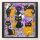 Niedliche, schwarze Katzen unter Kürbis, halloween Süßigkeiten, Fledermäuse, Besen, Sterne, Süßmais, Eichen, Vollmond, Herbstblätter und ein geschnittener Geist das ganze Set in einem Rahmen von leicht lila