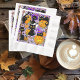 Niedliche, schwarze Katzen unter Kürbis, halloween Süßigkeiten, Fledermäuse, Besen, Sterne, Süßmais, Eichen, Vollmond, Herbstblätter und ein geschnittener Geist das ganze Set in einem Rahmen von leicht lila
