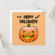 Frohe Halloween-Karte mit Kürbis, Fledermäusen und Spinne.