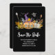 Save the Date Karte mit einem niedlichen Bild von Kürbis- und Gourmethäusern mit herumfliegenden Gespenstern und Fledermäusen.