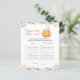 "Ein kleiner Kürbis ist unterwegs. Feiern Sie mit diesem Baby Cartoon Kürbis Thema für Baby Dusche Party! Wasserfarbener niedlicher Cartoon Kawaii Kürbis mit Herbstmütze (Kappe) und Herbstlauben. Auf der Rückseite der Karte befinden sich Herbstblätter.
