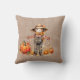 Rustikales, wasserfarbenes Herbstkissen mit einem bräunlich geflochtenen Hintergrund und einer schönen Anordnung von Kürbissen und farbenfrohen Blättern. Typografie wird in Orange mit schwarzem Hintergrund gemacht, um die Schrift zu heben. Die Kissenrückseite ist eine skurrile Keuche, die zwischen Kürbissen stehend ist. Hintergrund ist auch ein Imitat als Gewebe.