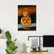 Halloween Poster mit Pumpkin Mess Design. Ein niedlicher junger Kürbis, der Halloween-Bonbons auf einem nicht so glücklichen Papa-Kürbis genießt. Schwarz-Orange-Farben.