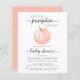 Eine niedliche, geschlechtsneutrale Babydusche-Einladung mit "A Sweet Little Pumpkin Is On its Way" in einer Mischung aus grauer Typografie und einem stilvollen Drehbuch sowie einer pastellorangefarbenen Wasserfarbe eines Kürbis. Sie können den Namen der Mutter personalisieren und Details in schlichter grauer Typografie duschen. Geben Sie auf Wunsch das Geschlecht des Babys an (z.B. "ist unterwegs").
