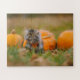 Eine sanfte, graue Katze sitzt in einem goldenen Herbstfeld hübsch zwischen hellen orangefarbenen Kürbissen. Die warmen Farben der Ernte kontrastieren wunderschön mit dem weichen Fell der Katze und schaffen eine herzerwärmende Herbstszene. Jedes Puzzleteil bringt Sie naher in die Herbstluft, rauschende Blätter und den stillen Charme einer Neugierde, die ihr Kürbisreich erforscht. Ideal für Katzenliebhaber und Fans von gemütlichen Herbstvibes! 🍂 🐱 ✨