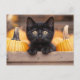 Adorable schwarze Kätzchen mit goldenen Augen flüchtige Blicke aus einer Kiste umgeben von Kürbissen.
