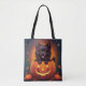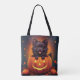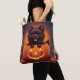 Cartoon-Bild eines schwarzen Pomchi (Spitz/Chihuahua) Welpe, die aus einem Jack-O-Lantern mit kleineren Kürbissen und Blätter herumfällt.