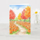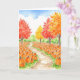 Diese Grußkarte zeigt ein Aquarellbild eines Weges, der durch einen Kürbispflaster führt, umgeben von bunten Fallbäumen.