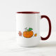 Diese 15 oz Kaffee-Tasse mit dunkelrotem Griff und innen präsentiert das Sprichwort Pumpkin Spice Me!, zusammen mit einem niedlichen orangefarbenen Jack-o-Laternen Kürbis und Latté, gekleidet mit einem gemütlichen grauen Schal und Brille, und Herbstblätter.