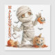 Pumpkin Tropfen - Mama mit einer Sweet Scare Magnetic Card Ein Cartoon Mummy in weißen Bandagen umhüllt steht mit breiten, orangen Augen und einem schelhaften Blick. Eine Hand klebt eine tropfende Jack-o’-Laterne, die andere hält einen lockeren Band. Rund um die Mumie strahlen drei geschnitzte Kürbis mit Persönlichkeit, Fledermäuse flattern im Hintergrund und Herbstblätter streuen sich über den Boden. Das Design verbindet den spöttischen Charme mit der spielerischen Einstellung, die Halloween Feststimmung mit kühnen Farben und skurrilen Details einfängt.