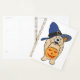 Whimsical cartoon dog in a wide wizard hat carries a glowing jack-o'-lantern. Bold lines, warm autumn colours, Halloween vibe, ideal for playful apparel and festive gifts.