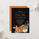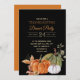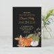 Erntedank Dinner Party Einladung mit Herbstlauben und Orange, Weiß und grüne Kürbis auf einem eleganten schwarzen Hintergrund.