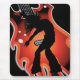 Cooles schwarzes mousepad/mousemat mit einer Silhouette eines Punkfelsensängertanzens auf einem groovy orange Flammengitarrenhintergrund - @ www.vectorportal.com. Ein trendy fantastisches Geschenk für die Jugendlichen, Musikliebhaber und jedermann GROOVY!!