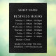 Erstellen Sie einfach ein individuelles Geschäftsstundenzeichen mit Ihrem Shop-Namen, Geschäftszeiten und Kontaktinformationen! Dieses Dekortürschild zeichnet sich durch geometrische Punkte für ein schlankes und berufliches Schaufenster aus. Probieren Sie es aus und sehen Sie, wie es aussieht. Passen Sie die Tage und Stunden an, um Ihr Unternehmen zu Anzug, und fügen Sie Ihre Kontaktdaten hinzu. Für verschiedene Anwendungen stehen mehrere Zeichenoptionen zur Verfügung. Weitere hilfreiche und informative Geschäftszeichen finden Sie in der Kollektion "Business Signs" .