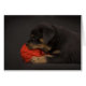 Rottweiler 1,5 Monate alter Welpe spielt mit roter Garnkugel