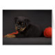 Rottweiler 1,5 Monate alter Welpe spielt mit roter Garnkugel