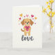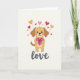 This card shows a biscuit-toned puppy centered on a creamy off-white background, looking up with wide glossy eyes, a small gentle smile, and rosy cheeks that read like a shy crush 🥰. The puppy cuddles a bright magenta heart against its chest, tied with a deep crimson bow like a sweet little gift. Above its head, smaller hearts float upward in blush pink, sunny yellow, and cheerful red, creating a soft trail that feels like affection rising into the air ❤️. Some of the hearts hang from thin curling lines while others drift freely, adding light movement around the pup. The lighting stays diffused and airy, keeping the pastel colors smooth and cozy rather than harsh. Near the bottom, the word “love” sits as a single line of text in deep charcoal, standing out clearly against the pale background. The puppy’s body is slightly angled with its paws wrapped around the heart, and the scattered hearts fan outward in a loose arc overhead.