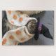 Machen Sie sich auf eine purpurne, spukhafte Herausforderung gefasst! Dieses Rätsel enthält eine gemütliche Katze, die in einem Hexenhut gekleidet und in eine Kürbis-gemusterte Decke verpackt ist und die den Zauber Halloween und den Charme der Katzen vereint.