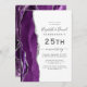 The left-hand edge of this elegant modern wedding anniversary party invitation features a purple watercolor agate border trimmed with silver faux glitter. The customizable text combines charcoal gray handwriting, copperplate and italic fonts on a white background. The reverse side features a matching purple and silver agate design.