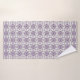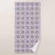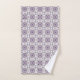 "Two images featuring a towel and washcloth with a repeating geometric floral pattern in purple and black. The towel is displayed hanging on a rod, and the washcloth is laid flat with a corner folded. The pattern conveys an elegant, decorative tone."