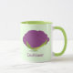 A food themed mug with a smiling purple Cauliflower character. The text can be customized.