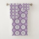 A towel and washcloth set with a geometric pattern is displayed. The design features white floral motifs on a purple background, creating a modern, elegant look.