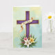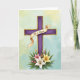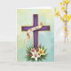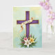 Designed with a tall cross in deep purple outlined in thin gold, the artwork draws your eye upward against a soft wash of pastel blue and green like a calm spring sky. A creamy banner drapes across the crossbar, as if gently laid there by caring hands, and it carries a short message in flowing dark lettering centered on the ribbon. At the base, a cluster of flowers gathers close together like friends leaning in for a photo, with a white lily in the middle framed by blush pink and sunny yellow blooms. Green leaves and stems curl around the bouquet, and a few closed buds in rosy pink and warm apricot hint at what’s about to open. The gold edging continues with small decorative touches along the cross, adding a subtle gleam without overpowering the scene. A small touch of spring charm comes through in the garden-like colors, paired with a sweet 🌷 accent near the floral base. Behind everything, faint cloud shapes drift across the pastel background, and a tiny 🐇 detail sits tucked near the lower edge beside the leaves.