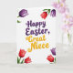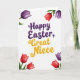 Designed with a bright spring look on a white background, this card centers on the words “Happy Easter, Great Niece” in two contrasting colors. “Happy Easter” sits prominently in deep purple lettering with gentle shading, giving it a soft, slightly textured look. Just beneath it, “Great Niece” appears in warm golden yellow, like sunshine against the white space, and the two lines feel like they belong together, like a close hug between family members. The lettering has flowing curves and a light bounce, adding a friendly, affectionate tone without needing extra decoration. In each corner, stylized flowers frame the message, with petals in rich red and dark purple and slim green stems that lean inward as if gathering around the greeting 🌷. The corner florals balance the layout so your eye naturally returns to the center text, keeping everything easy to read. The red and purple blossoms sit at all four corners, with small green leaves and subtle shadowing around the petals 🐰.
