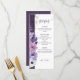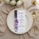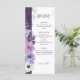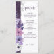 An elegant purple floral wedding menu card featuring soft watercolor flowers in lavender, blush, and white, paired with delicate botanical line art for a romantic and sophisticated look. The tall vertical layout with a slim floral border and clean white background creates a refined presentation for starters, main course, and dessert. A beautiful choice for couples creating a coordinated floral wedding stationery suite with a soft purple color palette.