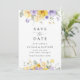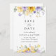 Invite friends and family in style and set the tone for your special day with this charming save the date card. Design features purple and yellow watercolor flowers and greenery on white background.